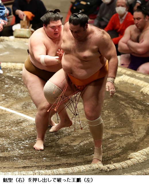 ▽新入幕の王鵬に魁聖は王鵬が押し出しで勝ちました。