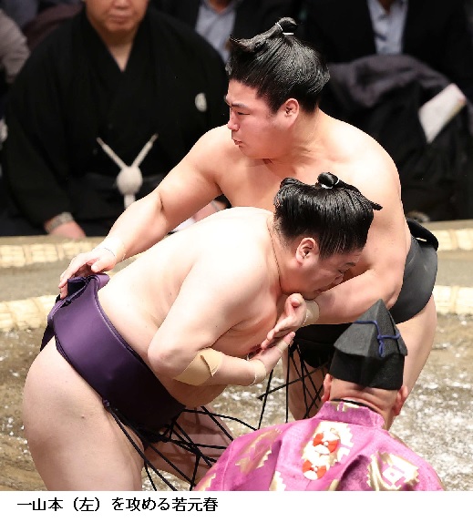 ▽新入幕の若元春に一山本は若元春が寄り切り。