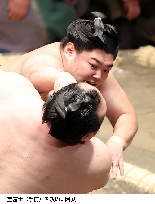 阿炎は力強い突き押しで実力者の宝富士を押し出し「相手の得意な相撲を出させなかったのでよかった。一番一番集中して、自分の相撲を取り切るという気持ちだ」と冷静に話していました。