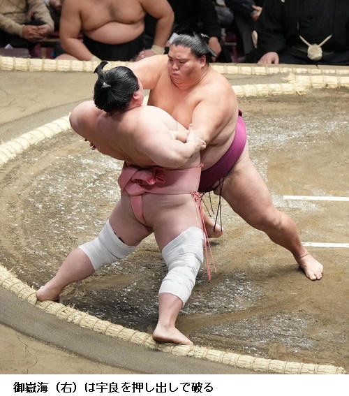 ▽御嶽海に宇良は御嶽海が押し出し。