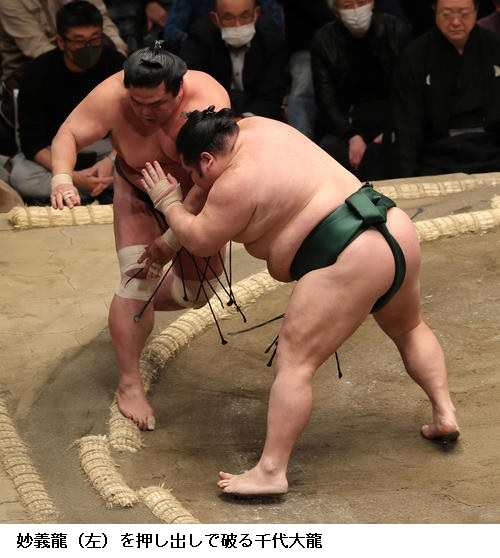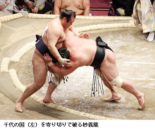 ▽千代大龍に妙義龍は千代大龍が押し出し。
