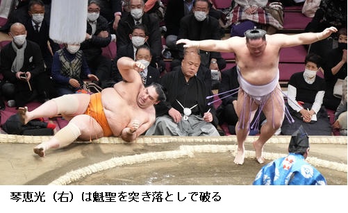 ☆琴恵光「うまく対応できました。自分らしい相撲がとれましたね。自分の持ち味が出ているので、それが(星に)つながっているのかと思う。攻める意識を常に持たないといけない」