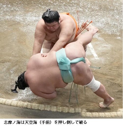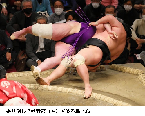 ▽妙義龍に志摩ノ海は妙義龍が押し出し。
