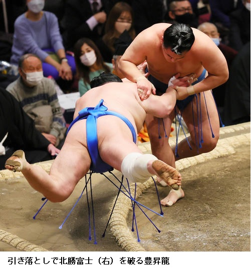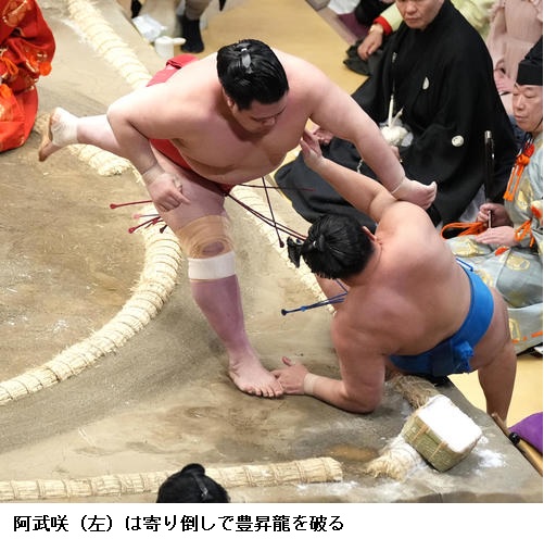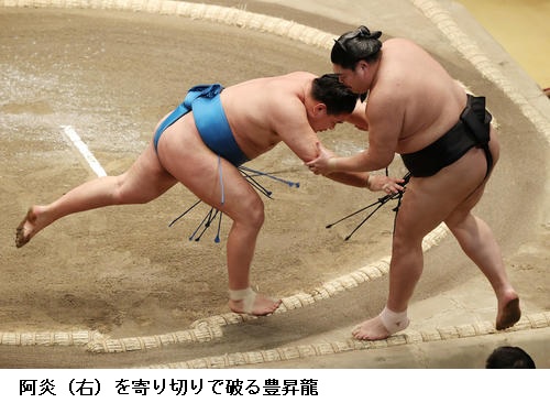 好調の阿炎を破った豊昇龍は「立ち合いで遅れないようにと思っていた。なんとか勝ててよかった。いい相撲を取って勝つと、疲れが大したものではないと感じるようになってきた」と明るく話していました。