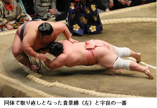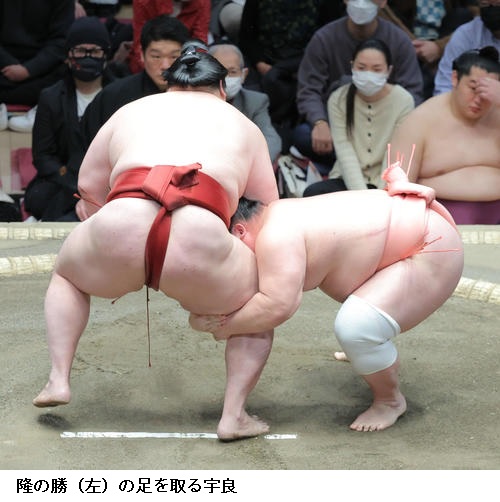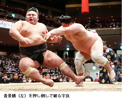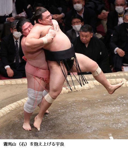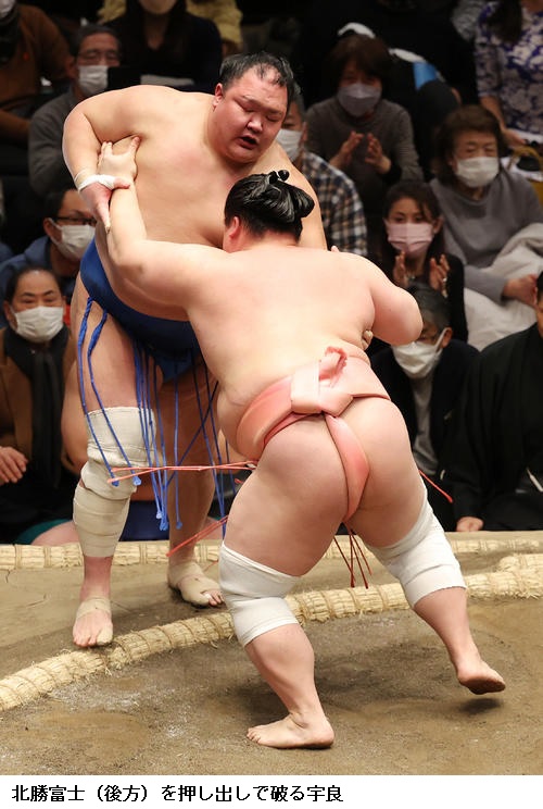 宇良は関脇 隆の勝に「足取り」で勝って星を五分に戻し、「流れに乗ることができたと思う。いまがいちばんふんばりどきですね」と述べました。また、上位との対戦が続いた前半戦について、「人間はこんなに強いんだと感じた」と話していました。