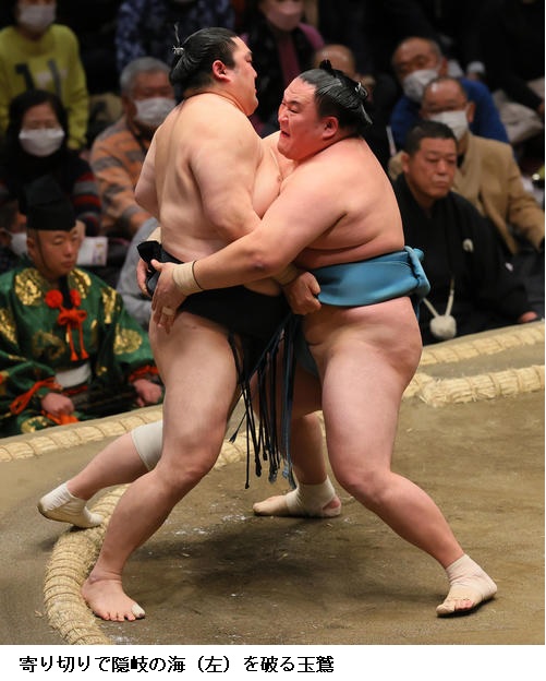 ☆玉鷲「最初は待っただったけど、しっかり気持ち入れて当たって自分の相撲を取れた。(後半は)疲れがたまってどうなるか分からないので、元気なうちにいい相撲を取っていきたい」