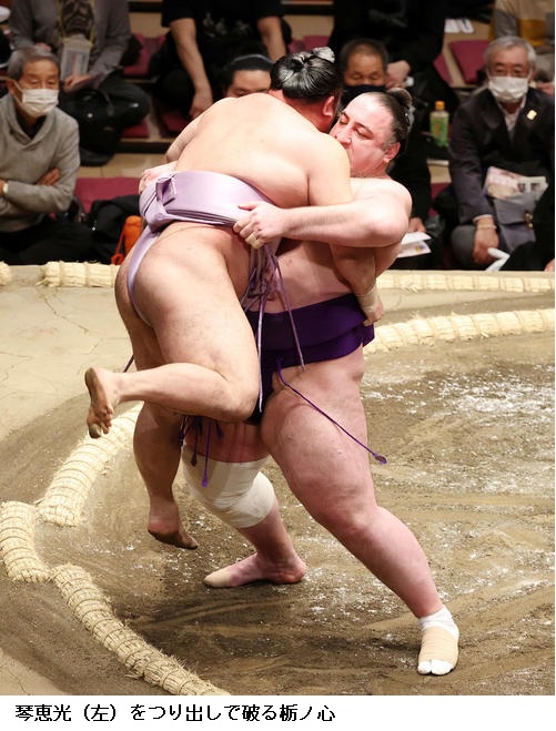 ▽琴ノ若に栃ノ心は琴ノ若が押し出し。