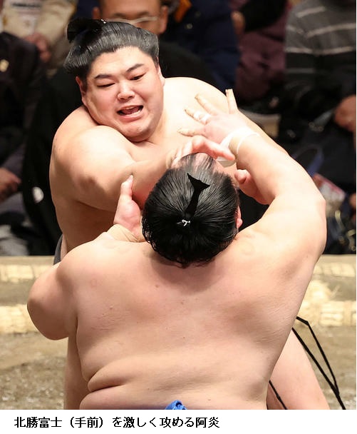 阿炎は連敗を2で止めて7勝目を挙げ「きょうは無意識に思い切ったことができた。悪くないと思うので、思い切った相撲を取っていきたい」と残りを見据えていました。