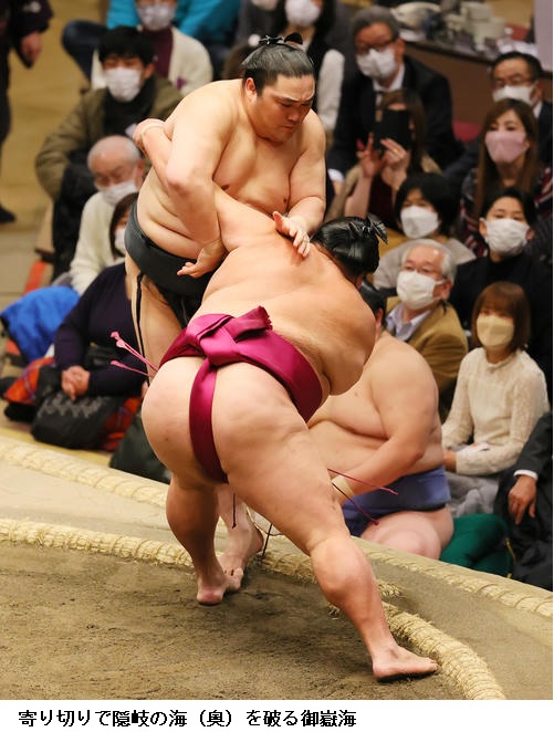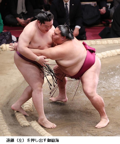大相撲初場所9日目 関脇 御嶽海 隠岐の海を寄り切り9連勝 ―― 大相撲初場所9日目。関脇 御嶽海は隠岐の海を寄り切って、初日から9連勝としました。
