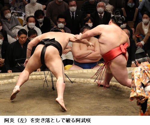 ○阿武咲 2、3発突いたときに相手も下を向いていたので(はたきを)食うなと思った。終始落ち着いていけた。初日にしては変な緊張感なく取れた。