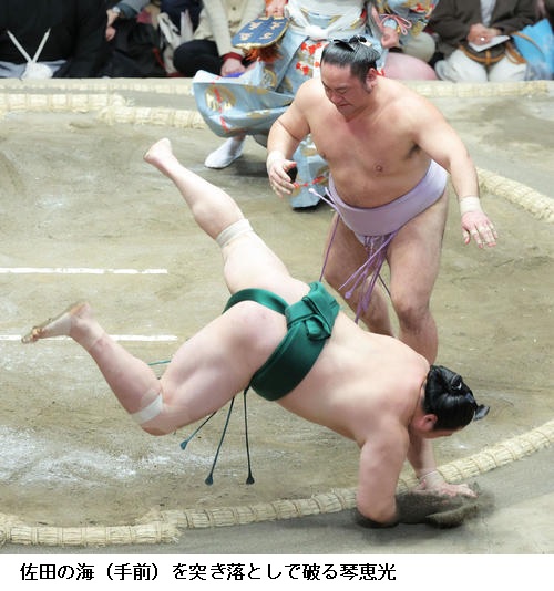 ▽琴恵光に佐田の海は琴恵光が突き落としで勝ちました。