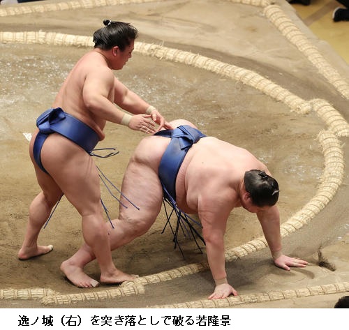 ▽逸ノ城に若隆景は若隆景が突き落とし。