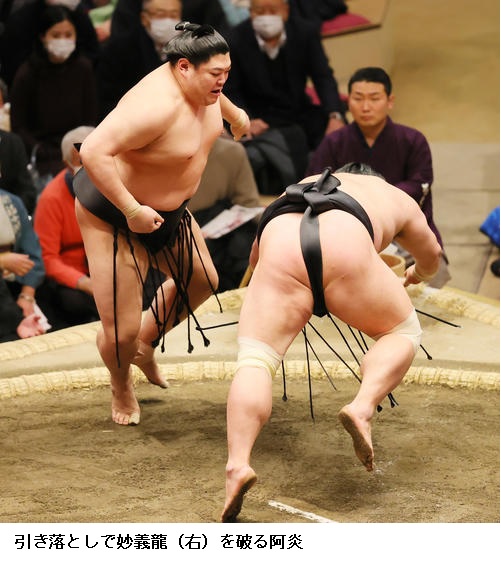 ○阿炎 前に出られましたし、相手の得意な相撲をとらせなかったのでよかったと思います。師匠(元関脇寺尾の錣山親方)からは「勝っても負けても思い切りとれ」と言ってもらいました。(今年の目標)見ている人に認めてもらえるように努力を重ねる1年にしたい。