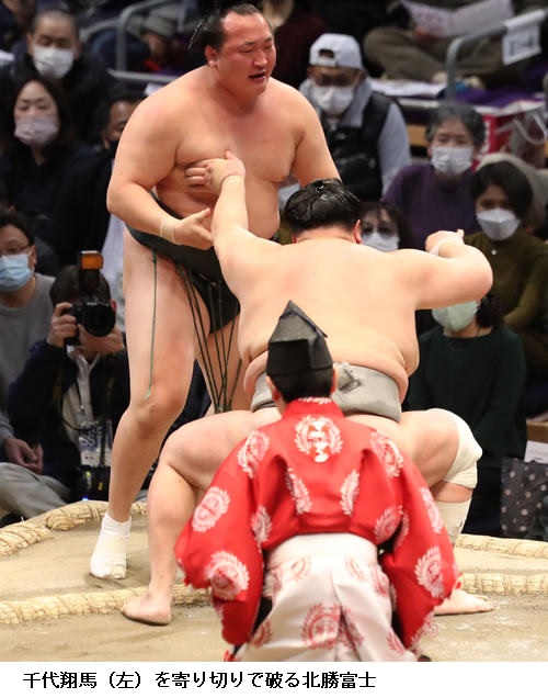 ▽北勝富士に千代翔馬は、北勝富士が寄り切り。