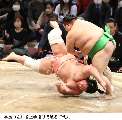 ▽宇良に千代丸は、千代丸が上手投げで勝ち越しました。宇良は技能賞を受賞しました。