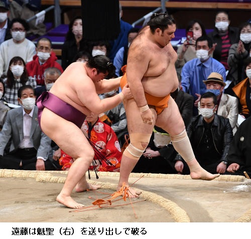 ▽魁聖に遠藤は、遠藤が送り出しで勝ち越し。魁聖は負け越しました。
