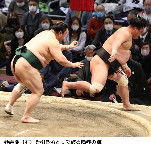 ▽隠岐の海に妙義龍は、隠岐の海が引き落とし。