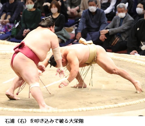 ▽大栄翔に石浦は、大栄翔がはたき込みで勝ち越しました。石浦は負け越しです。