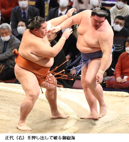 ▽大関 正代に御嶽海は、御嶽海が押し出し。