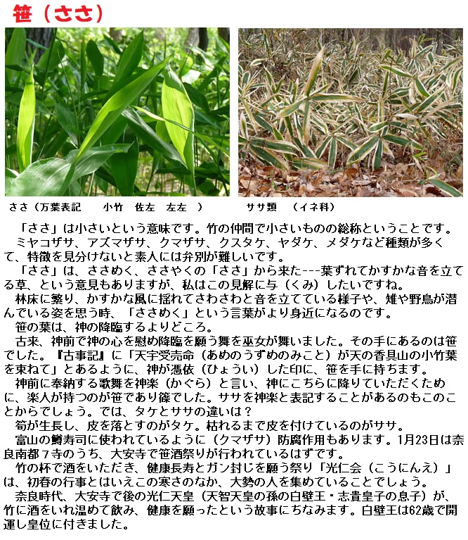 笹(ささ)はイネ科の植物で、一般的には竹よりも背丈の低いものを指します。笹は、古代から神降しのための聖なる植物とされていたようです。笹は、歌に詠まれるとき、「ささ」という音と、その風にゆれる音を意識していたのだろうと考えられています。