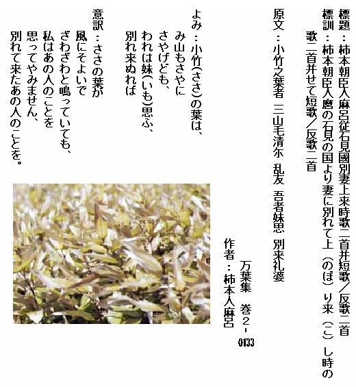 巻2‐0133:笹の葉はみ山もさやにさやげども我れは妹思ふ別れ来ぬれば