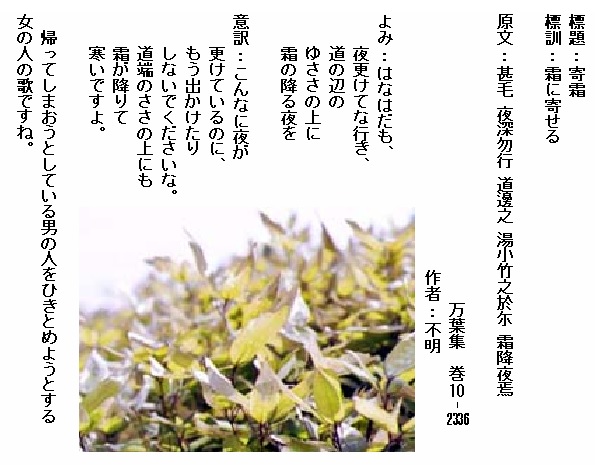 巻10-2336:はなはだも夜更けてな行き道の辺の斎笹の上に霜の降る夜を