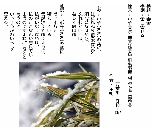 巻10-2337:笹の葉にはだれ降り覆ひ消なばかも忘れむと言へばまして思ほゆ