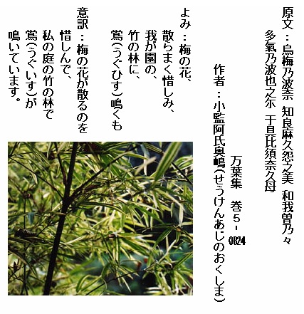 巻5‐0824:梅の花散らまく惜しみ我が園の竹の林に鴬鳴くも