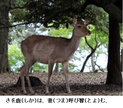 意訳:われらが大君が治めていらっしゃる大和の国は神の御代より代々お治めになっている皇祖の国である。生まれ出てくる御子たちが次々に治められるとかって定められた奈良の都はかげろうの立つ春ともなれば、春日山の御笠山の野辺に桜の花が咲く。その木陰で貌鳥(かほどり)(カッコウ)が絶え間なく鳴く。露霜の降りる秋ともなれば、生駒山の飛火が岳に萩の枝をからませ散らして、牡鹿が妻を呼んで鳴き立てる。山を見れば、見飽きることがなく、里は里で住み心地がよい。大宮人たちもずっと長らく思っていたことは、天地の果てのさきまで、代々ずっと栄え続けると思って大宮を頼みにしていた奈良の都。新しい時代になったということで、大君の仰せのままに、都を遷され、春の花々が移り変わり、群れ鳥がいっせいに飛び立つように、大宮人たちは立ち去っていった。かっては大宮人たちが踏みならして通った奈良の都の道は馬も人も行かなくなり、すっかり荒れ果ててしまった。