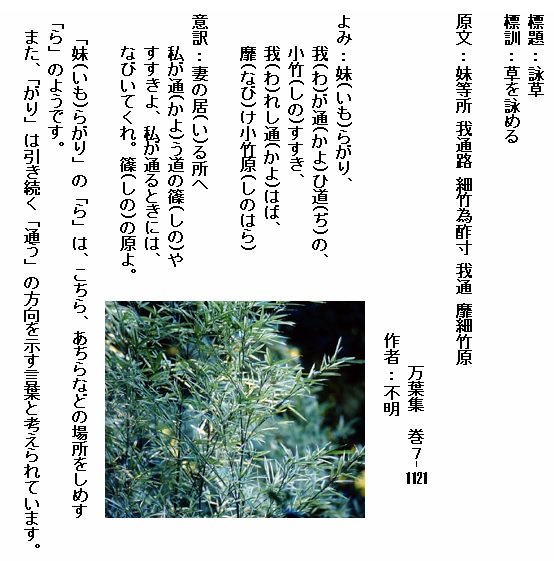 巻7-1121:妹らがり我が通ひ道の小竹すすき我れし通はば靡け小竹原