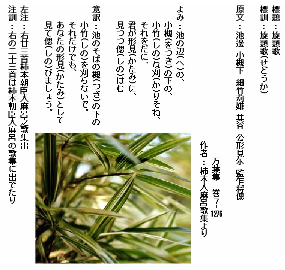 巻7-1276:池の辺の小槻の下の小竹な刈りそねそれをだに君が形見に見つつ偲はむ