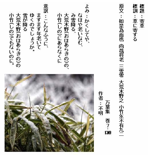 巻7-1349:かくしてやなほや老いなむみ雪降る大荒木野の小竹にあらなくに