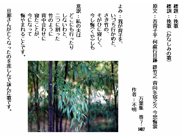 巻7-1412:我が背子をいづち行かめとさき竹のそがひに寝しく今し悔しも