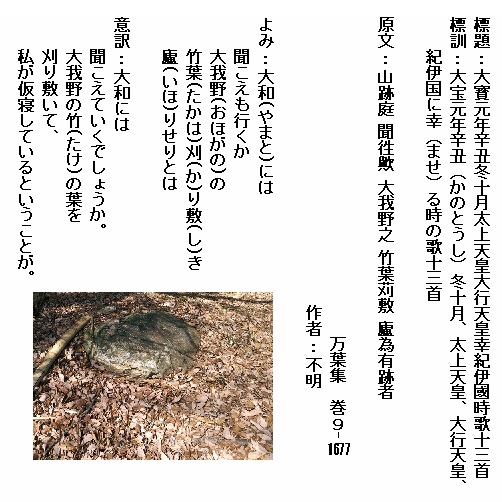 巻9-1677:大和には聞こえも行くか大我野の竹葉刈り敷き廬りせりとは