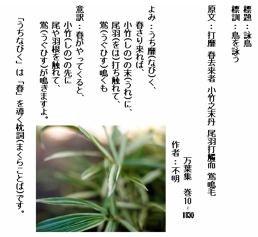 巻10-1830:うち靡く春さり来れば小竹の末に尾羽打ち触れて鴬鳴くも
