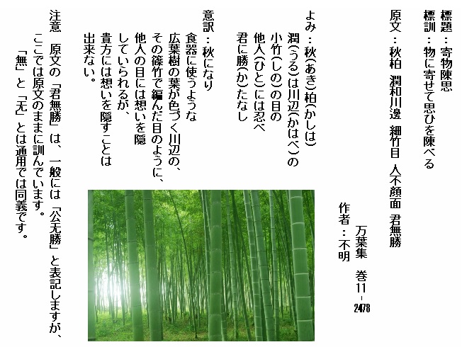 巻11-2478:秋柏潤和川辺の小竹の芽の人には忍び君に堪へなくに