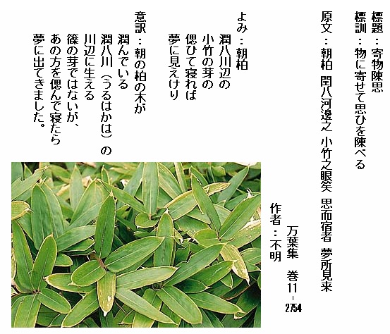 巻11-2754:朝柏潤八川辺の小竹の芽の偲ひて寝れば夢に見えけり