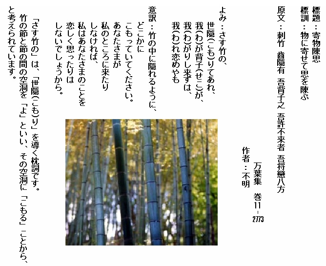巻11-2773:さす竹の世隠りてあれ我が背子が我がりし来ずは我れ恋めやも