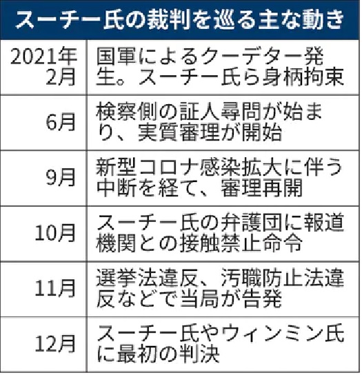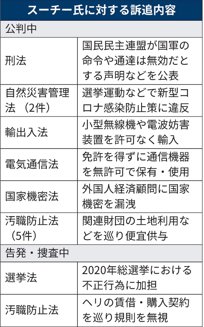 スーチー氏はクーデター後、小型無線機を無許可で輸入・使用したとして輸出入法や電気通信法違反などの微罪で訴追された。その後、最高刑が禁錮14年の国家機密法違反や同15年の汚職防止法違反など多数の重罪も加わり、これまでに11件で公判が始まった。最高刑の合計は禁錮100年を超す。同国では刑罰は合算されるため、国軍の支配が続く限りスーチー氏の政界復帰は絶望的だ。