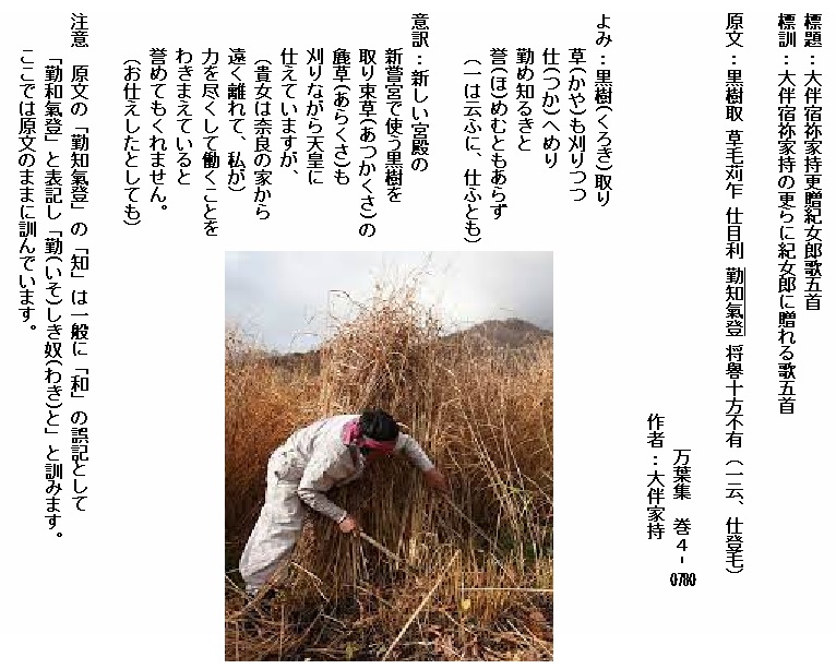 巻4‐0780:黒木取り草も刈りつつ仕へめどいそしきわけとほめむともあらず