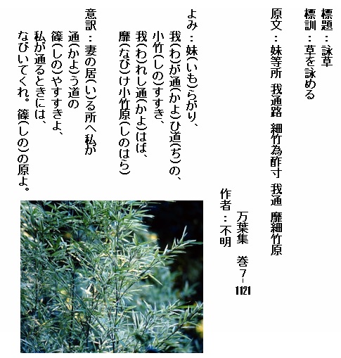 巻7-1121:妹らがり我が通ひ道の小竹すすき我れし通はば靡け小竹原