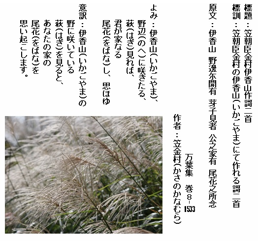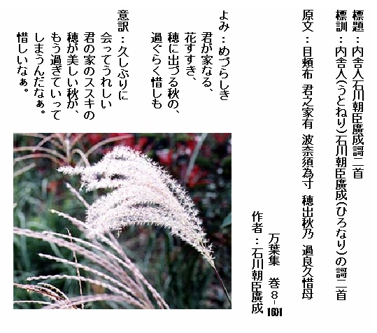 巻8-1601:めづらしき君が家なる花すすき穂に出づる秋の過ぐらく惜しも