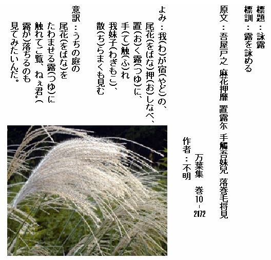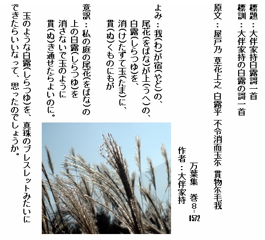 巻8-1572:我が宿の尾花が上の白露を消たずて玉に貫くものにもが