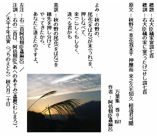 巻8-1577:秋の野の尾花が末を押しなべて来しくもしるく逢へる君かも