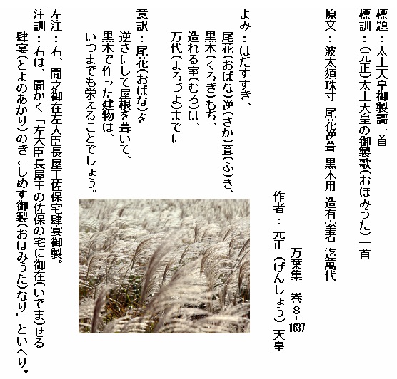 「はだすすき」は穂がないススキ。尾花はススキの穂。「逆(さか)葺き」は屋根を葺くとき穂先を下にして並べることです。「黒木もち」は「黒木を用いて」という意味。黒木は皮のままの丸太のことをいい、皮を剥いだ木は白木といいます。新天皇に天皇家の永続を託した歌です。