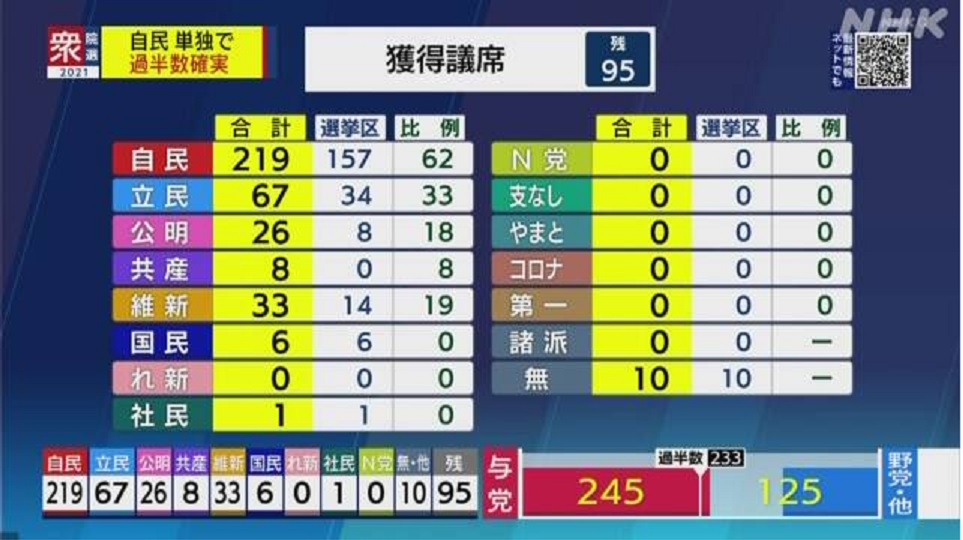 開票が進む小選挙区や比例代表の各ブロックの得票状況から、自民党は今後さらに議席を上積みする見通しで、単独で衆議院の過半数にあたる233議席を上回ることが確実な情勢となりました。 (NHK NEWS WEB 2021年10月31日 23時41分)