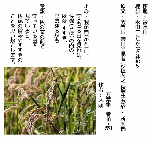 よみ:天地と ともにもがもと 思ひつつ ありけむものを はしけやし 家を離(はな)れて 波の上ゆ なづさひ来にて あらたまの 月日も来(き)経(へ)ぬ 雁がねも 継ぎて来鳴けば たらちねの 母も妻らも 朝露に 裳の裾ひづち 夕霧に 衣手(ころもて)濡れて 幸(さき)くしも あるらむごとく 出で見つつ 待つらむものを 世間(よのなか)の 人の嘆きは 相思はぬ 君にあれやも 秋萩の 散らへる野辺の 初尾花(はつをばな)仮廬(かりほ)に葺きて 雲(くも)離(はな)れ 遠き国辺(くにへ)の 露霜の 寒き山辺(やまへ)に 宿りせるらむ