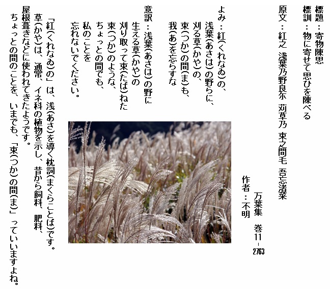 巻11-2763:紅の浅葉の野らに刈る草の束の間も我を忘らすな