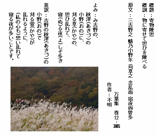 巻12-3065:み吉野の秋津の小野に刈る草の思ひ乱れて寝る夜しぞ多き