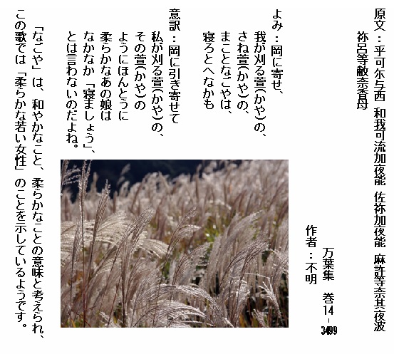 巻14-3499:岡に寄せ我が刈る萱のさね萱のまことなごやは寝ろとへなかも